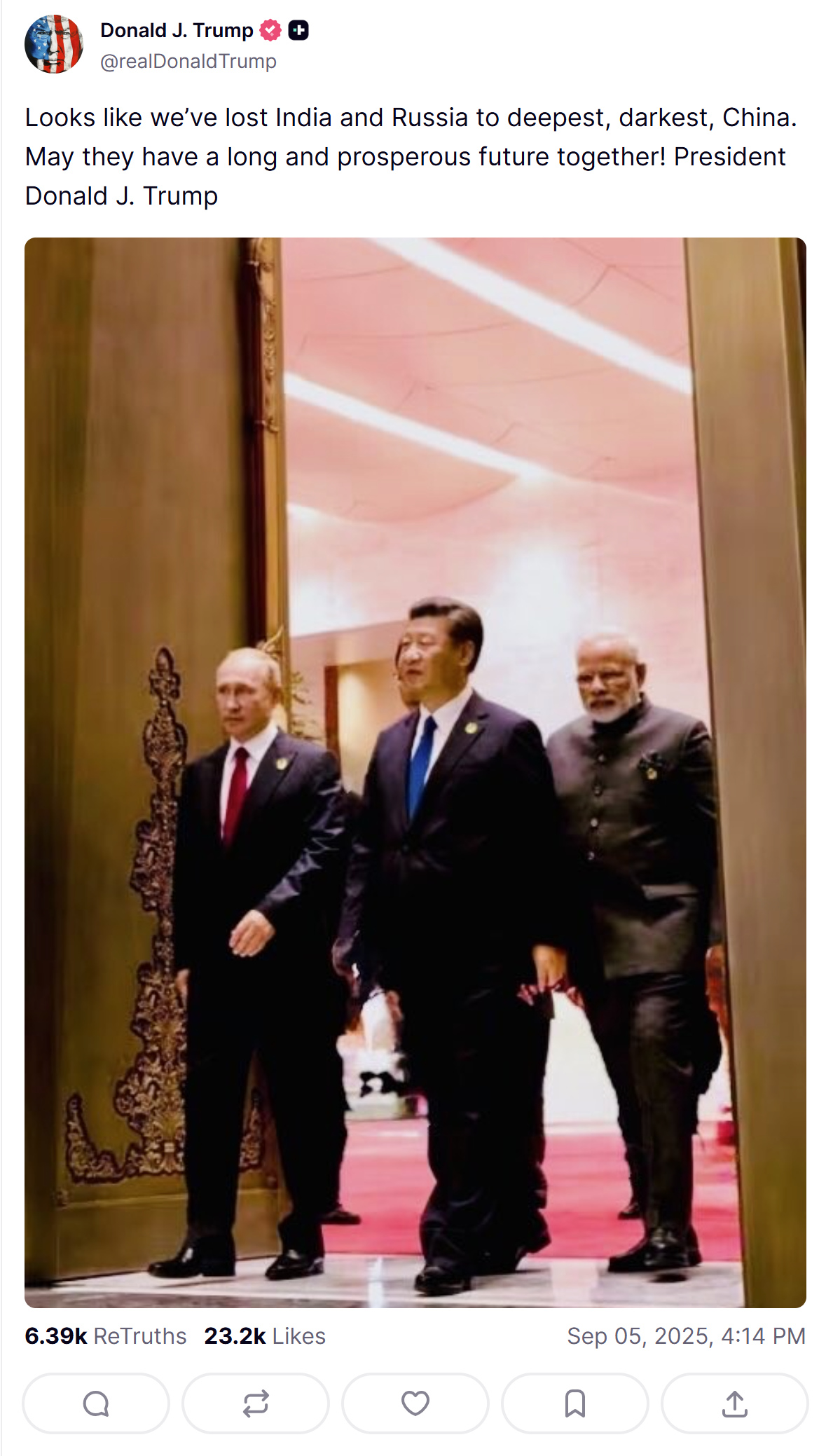President Donald Trump posted on his Truth Social account that India and Russia are now firmly tied to China and have drifted away from the US orbit. Trump also demanded that Europe end Russian oil imports and place pressure on China.