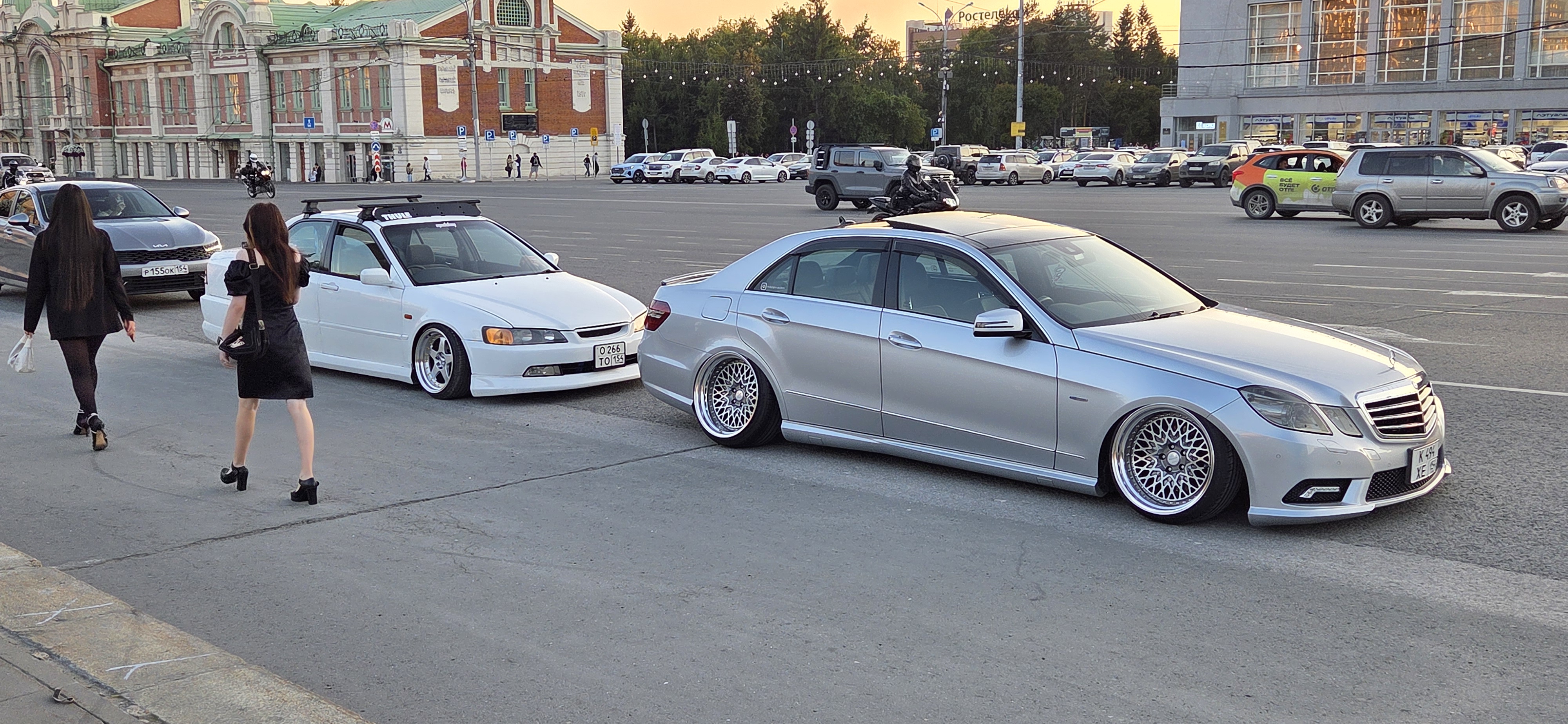 Immediately before Lenin are two low riders, parked here in the center of town where everyone can enjoy their shine as much as the proud owners do. Their drivers are looking sharp, lounging on the low wall of Lenin’s pedestal. The evening is pleasantly warm. There are lots of people out. A spotless low rider with a shiny Mercedes emblem is pretty much a chick magnet I would say.